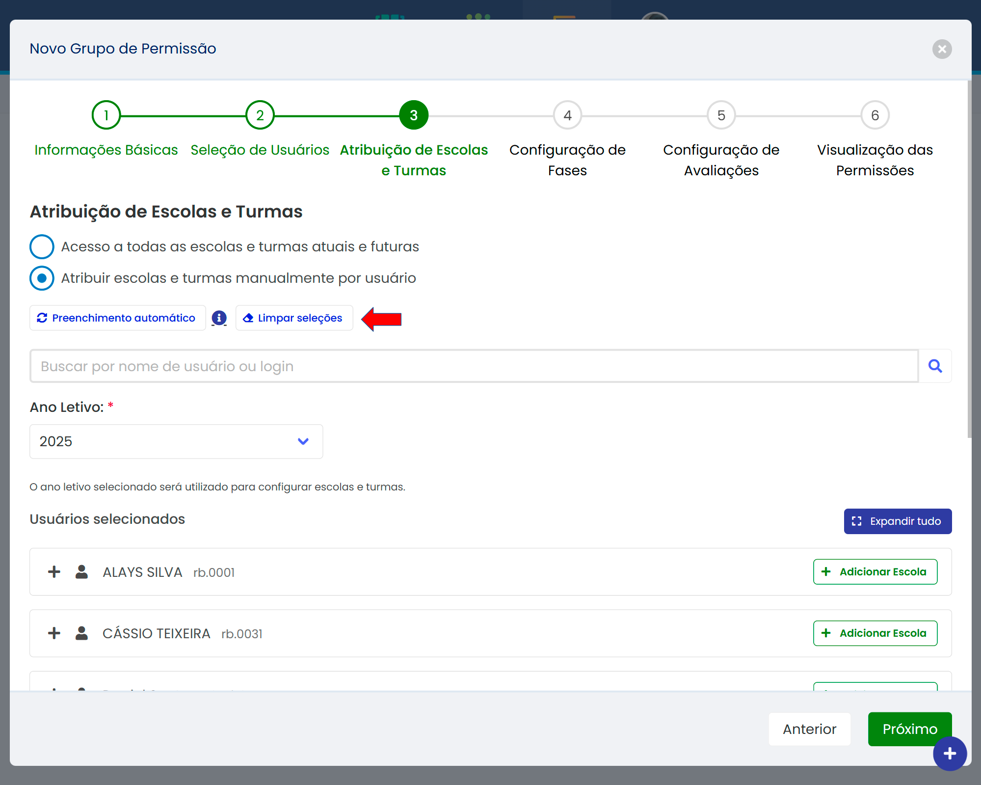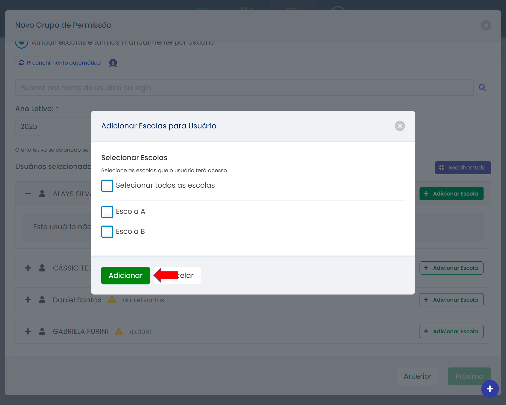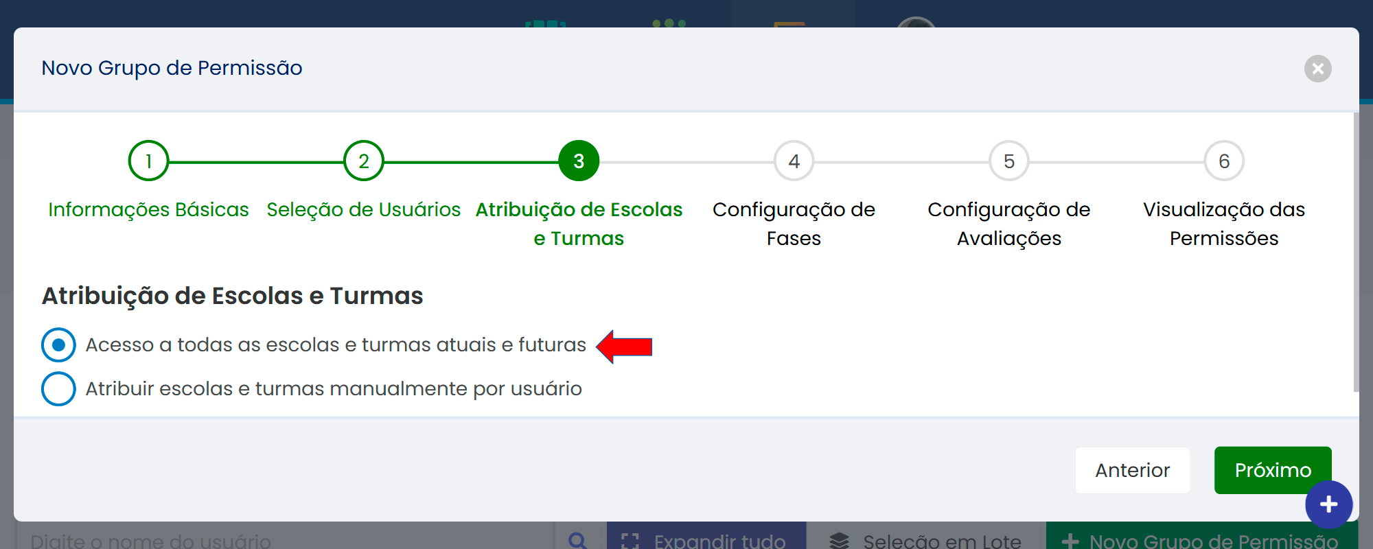 Nesta etapa, é definido o escopo de atuação de cada usuário dentro do grupo, determinando em quais escolas e turmas ele poderá corrigir avaliações.