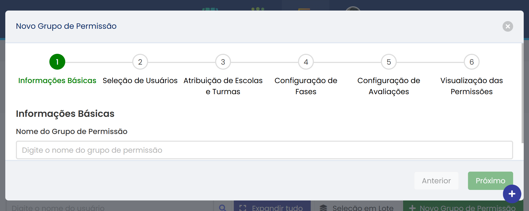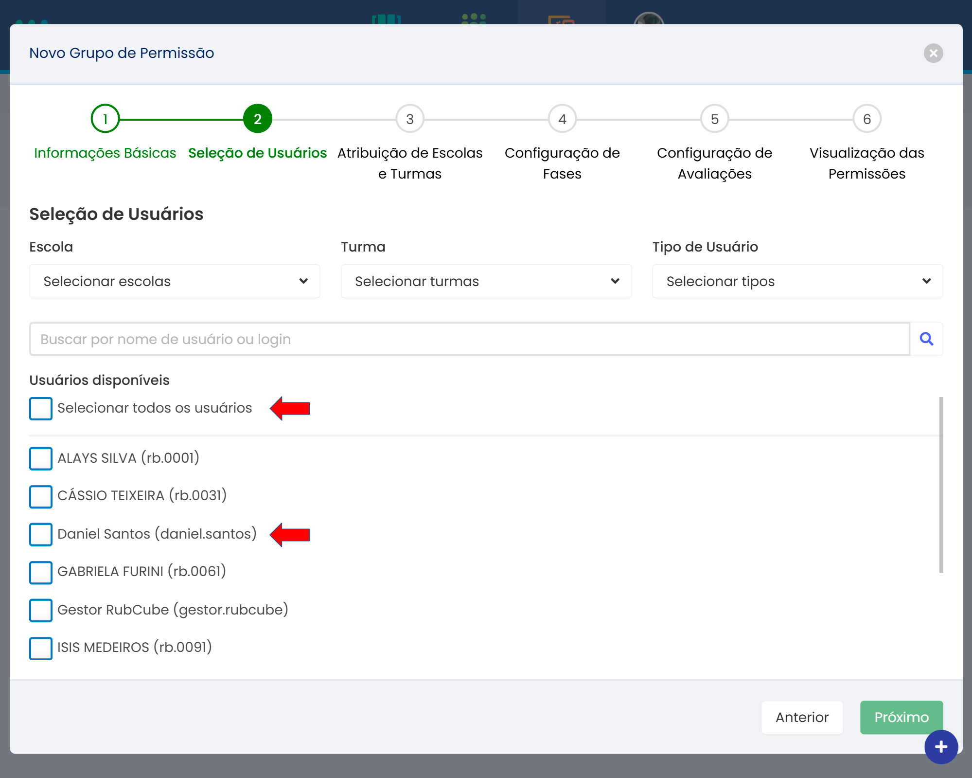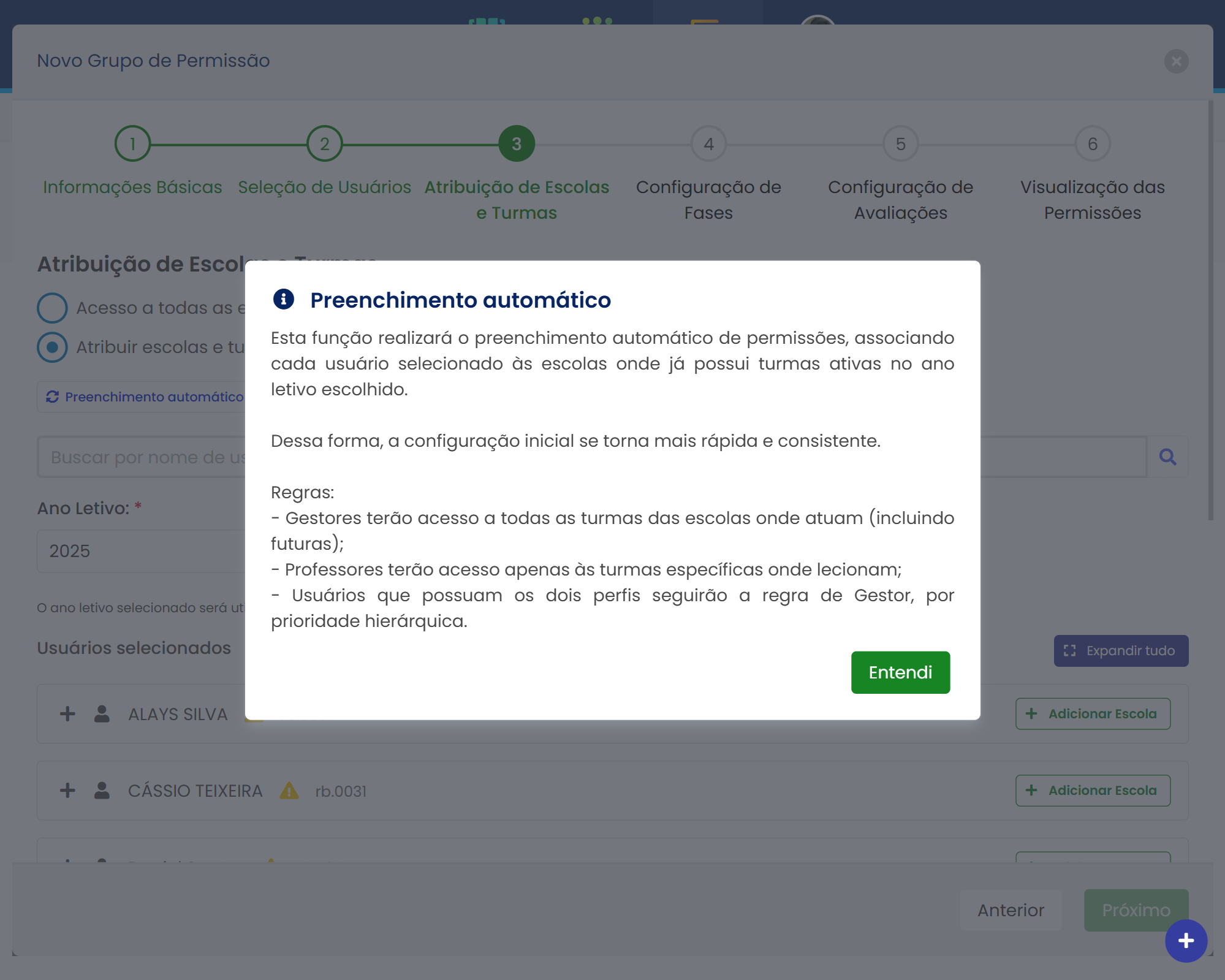 Nesta etapa, é definido o escopo de atuação de cada usuário dentro do grupo, determinando em quais escolas e turmas ele poderá corrigir avaliações.