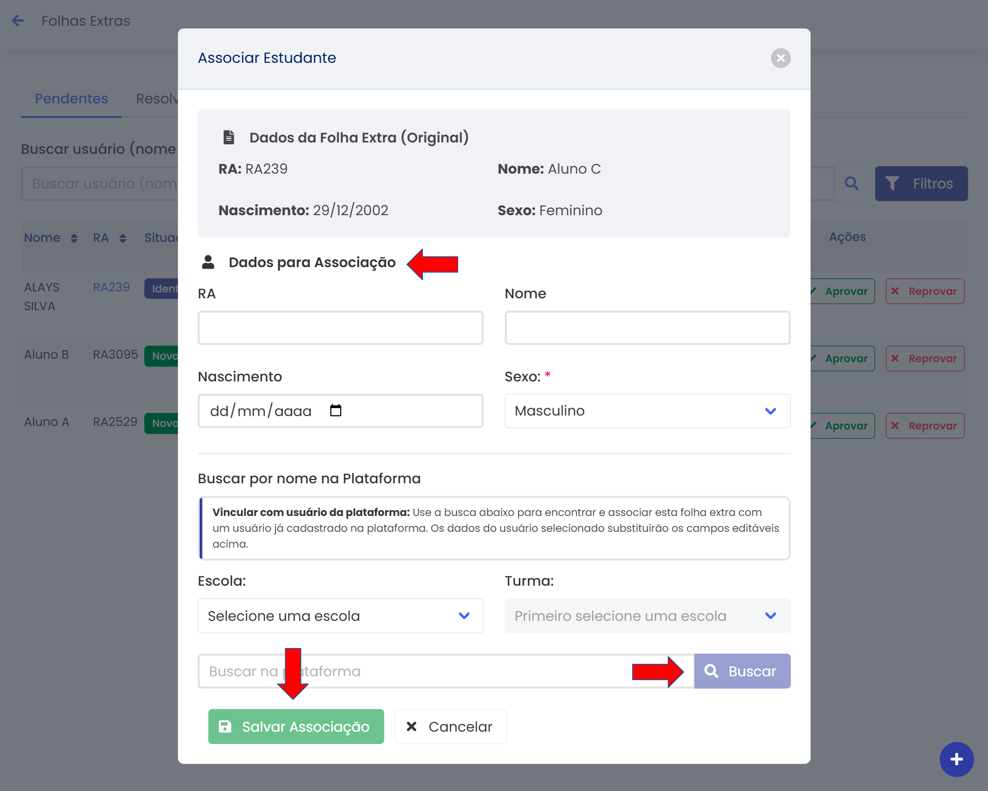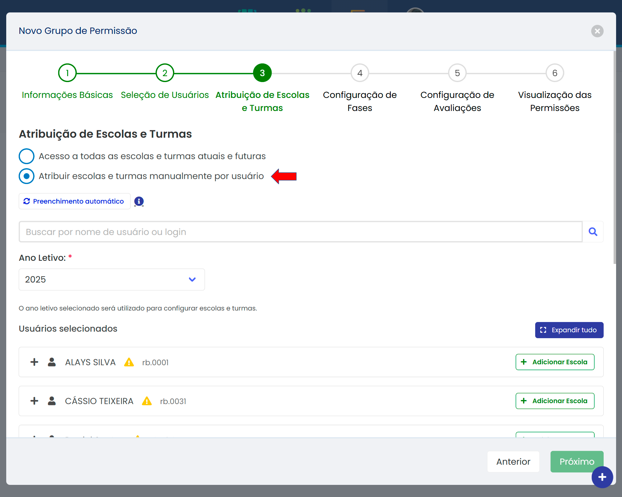 Ao escolher a atribuição manual, o sistema permite incluir escolas específicas para cada usuário.