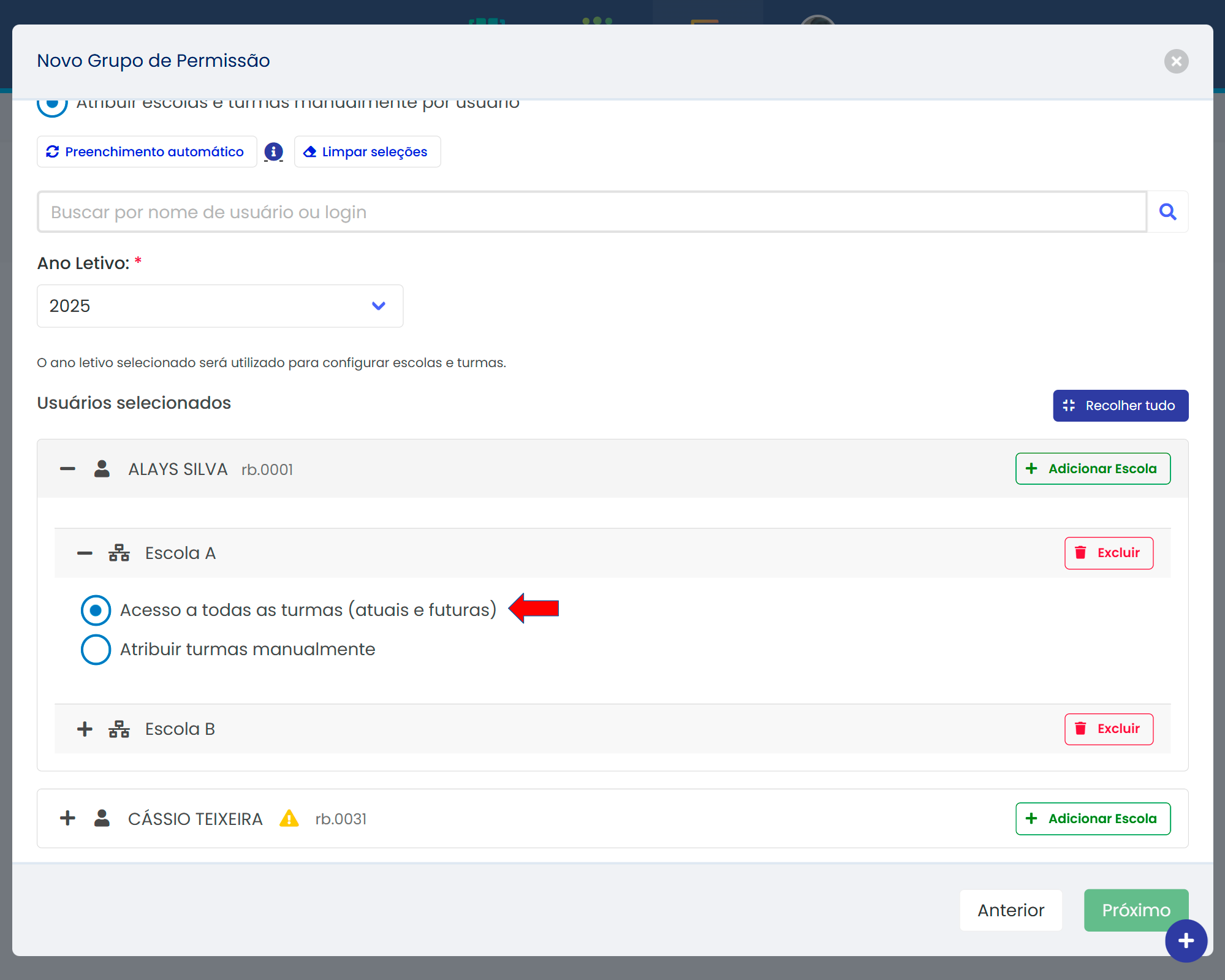 Garante que o usuário terá acesso imediato a todas as turmas da escola selecionada, incluindo as que forem criadas futuramente.
