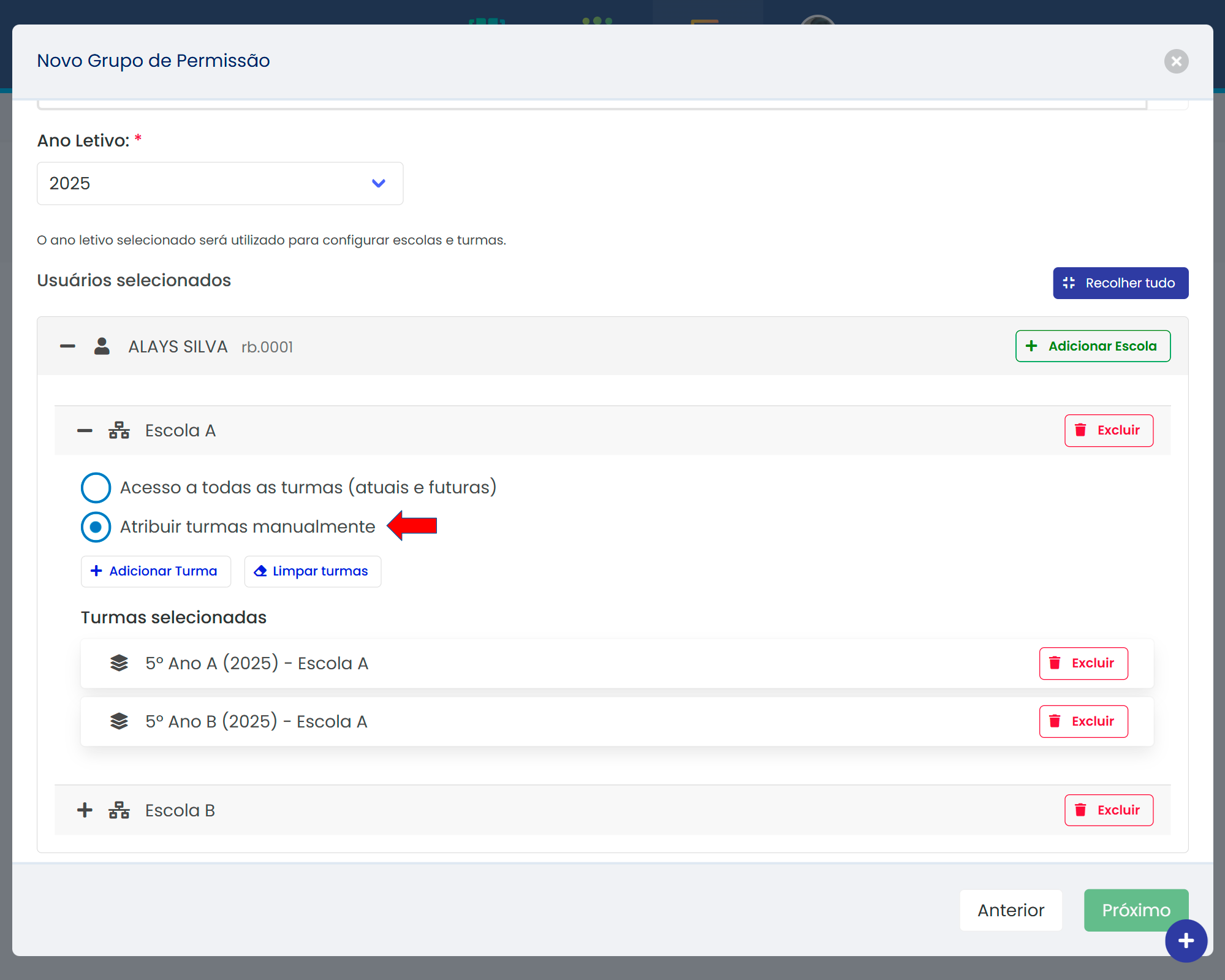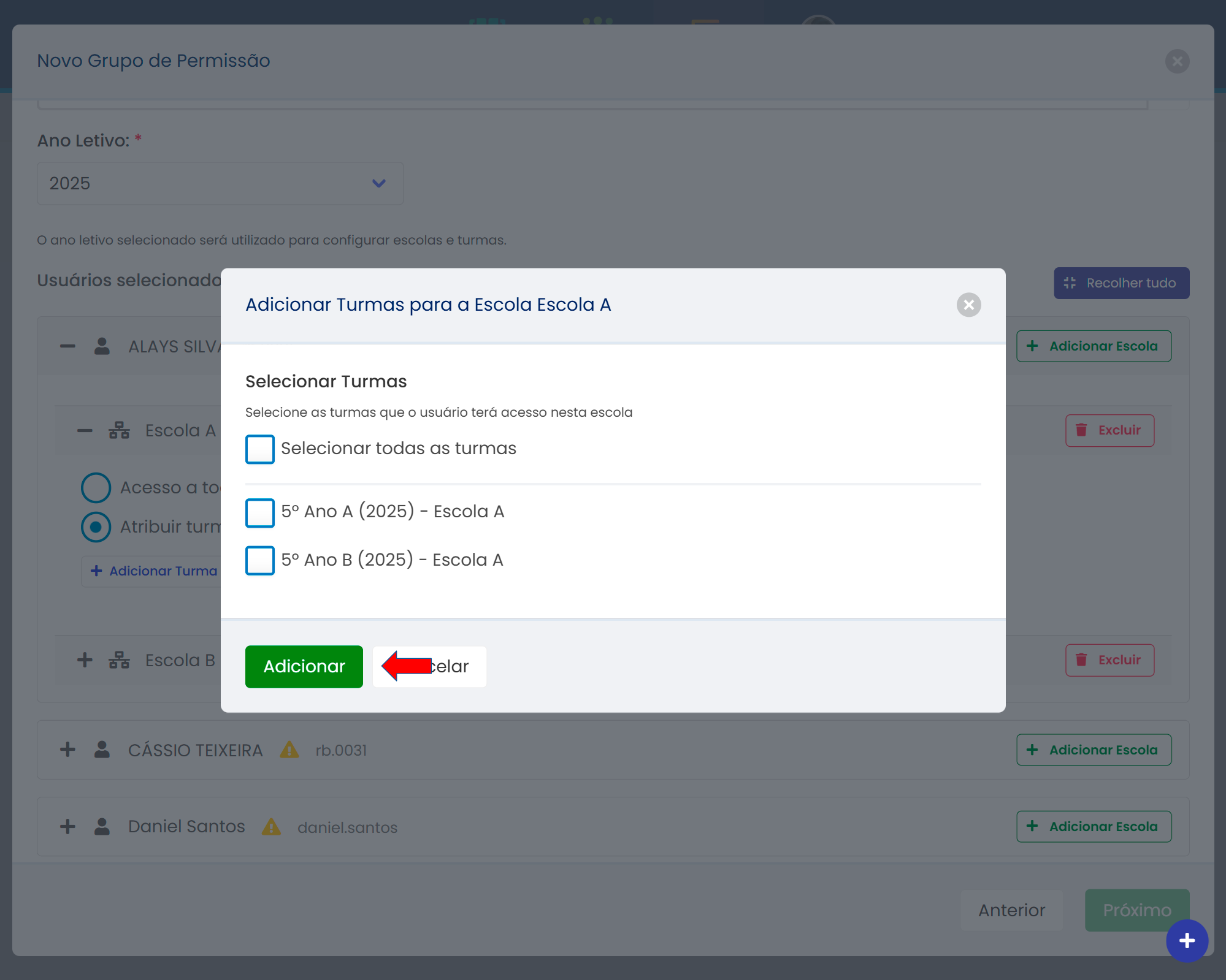 Dentro de cada escola vinculada, é necessário definir as turmas que o usuário poderá acessar.