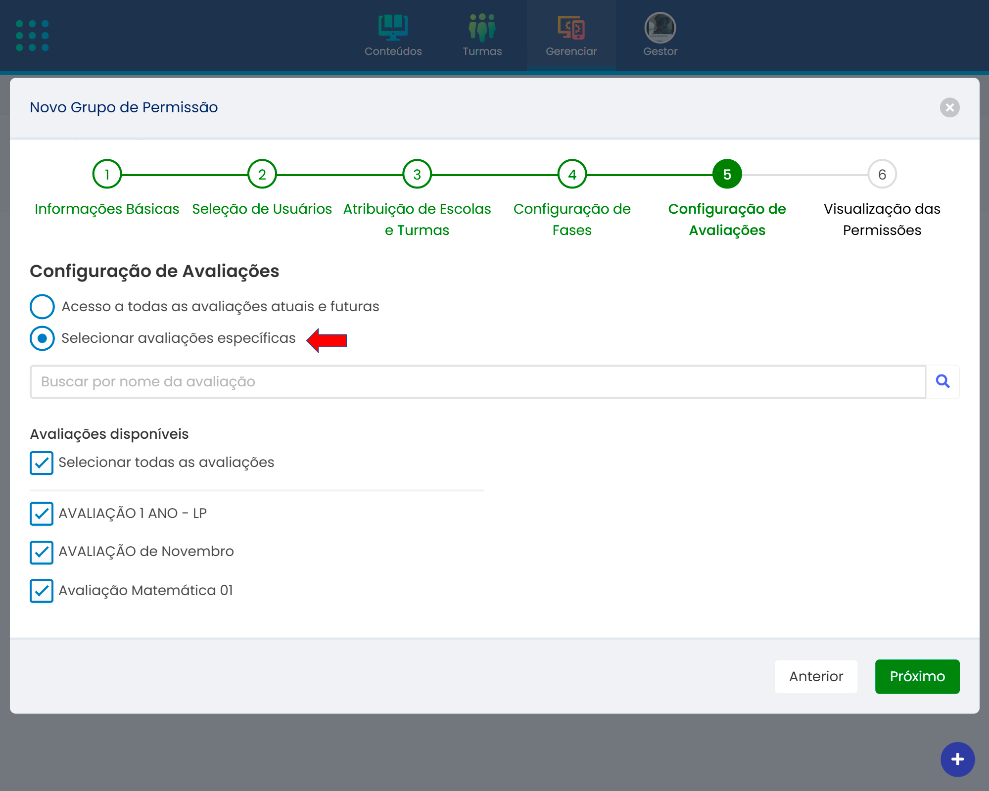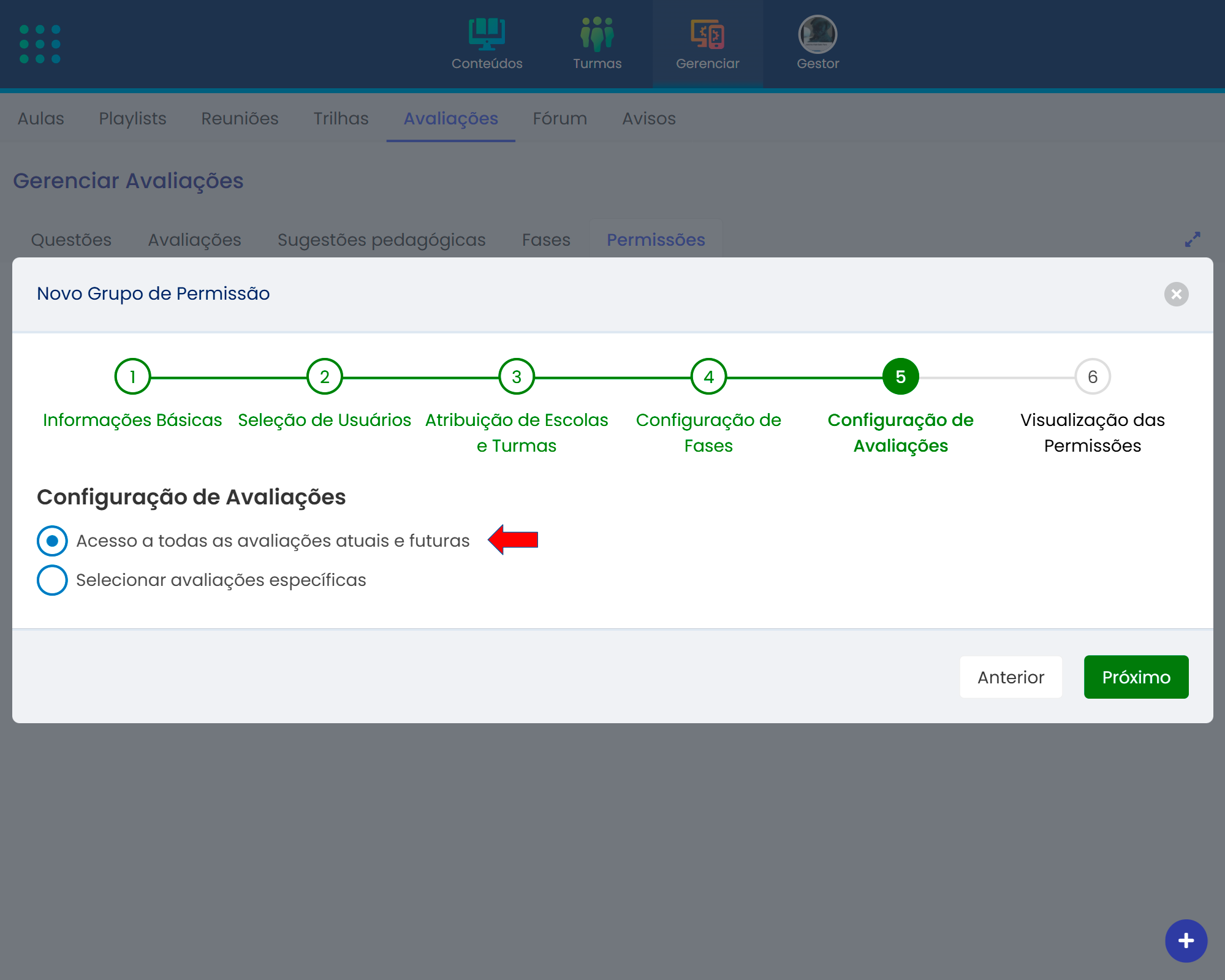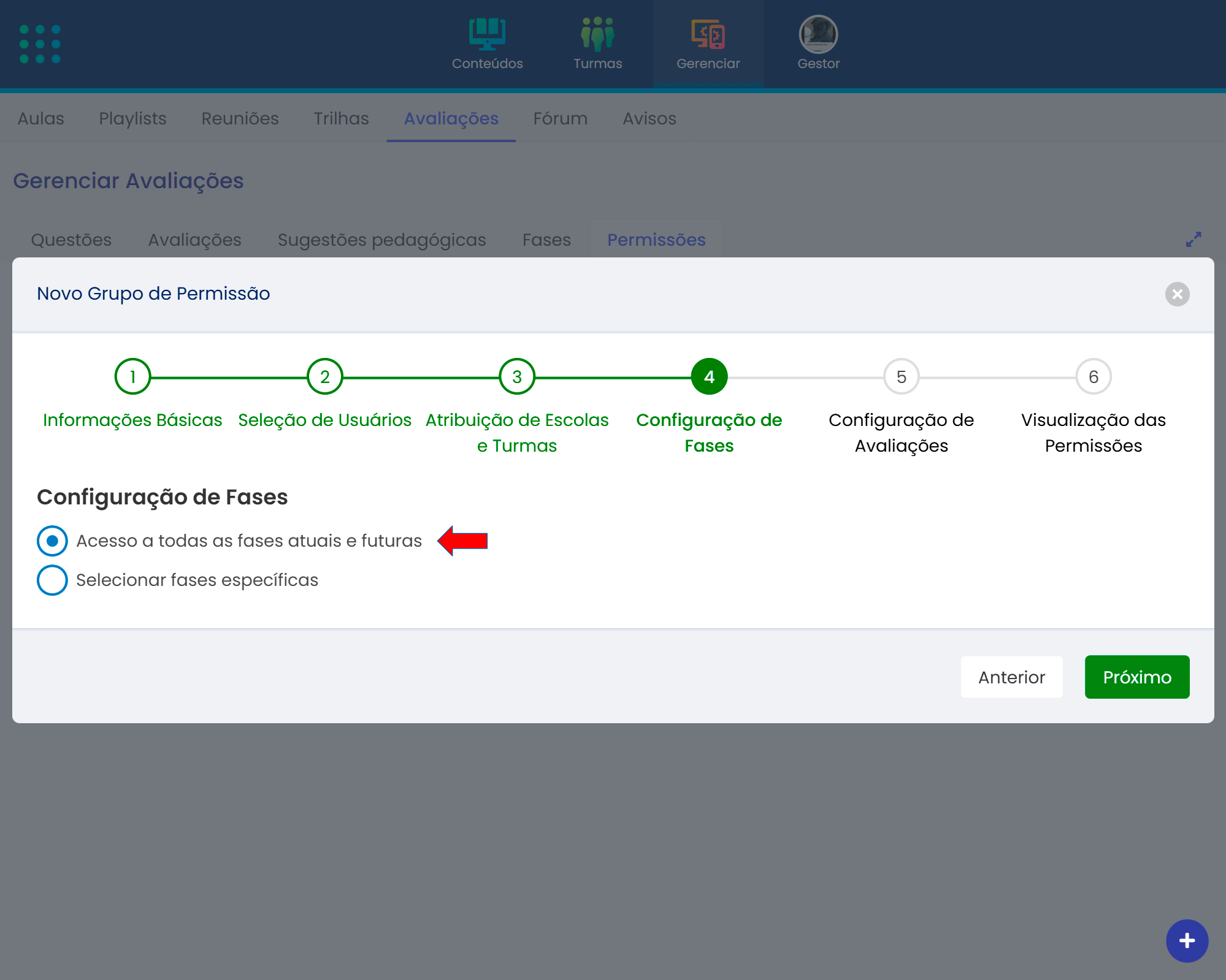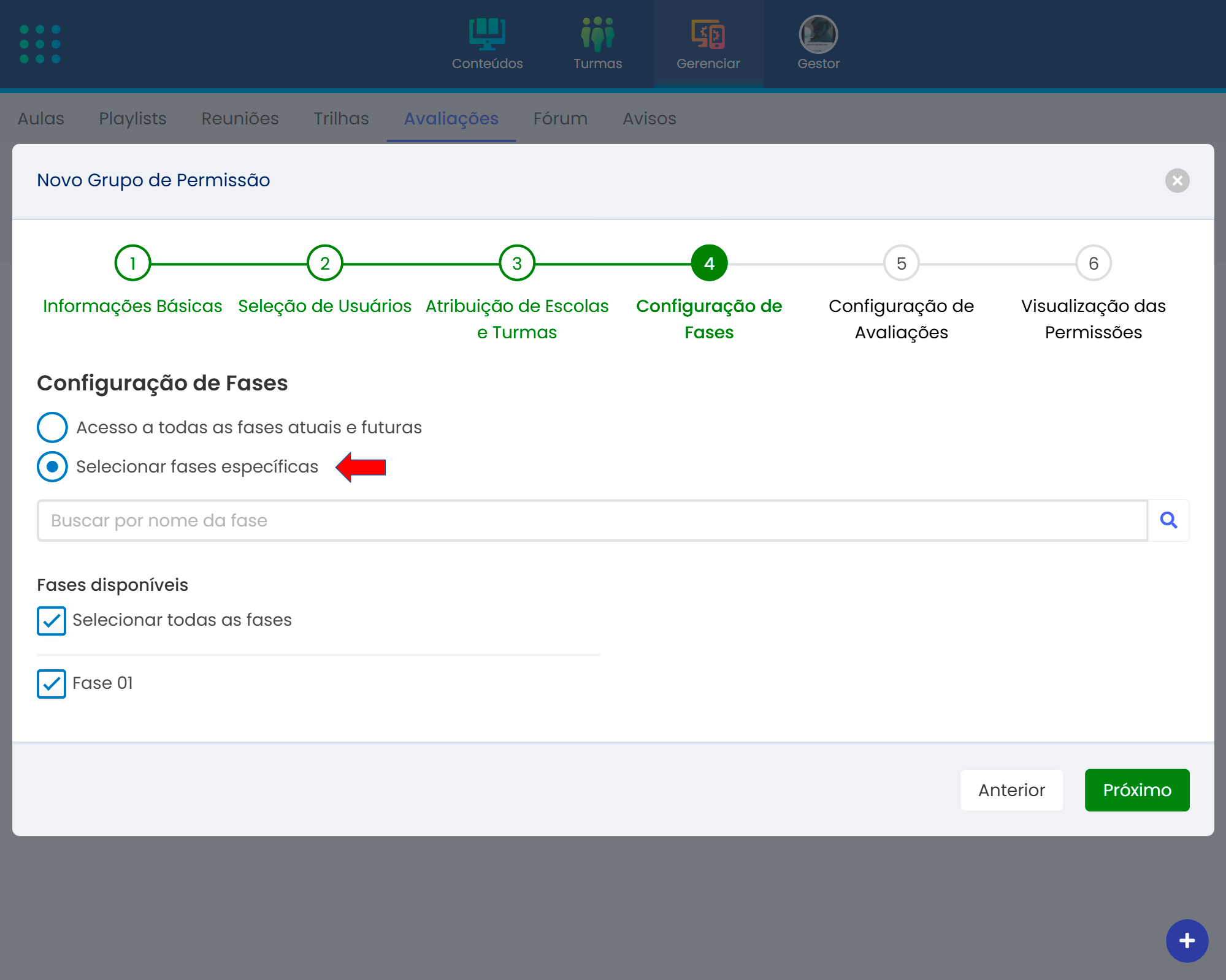 Nesta etapa, é definido em quais fases do processo de avaliação os usuários terão permissão para atuar.