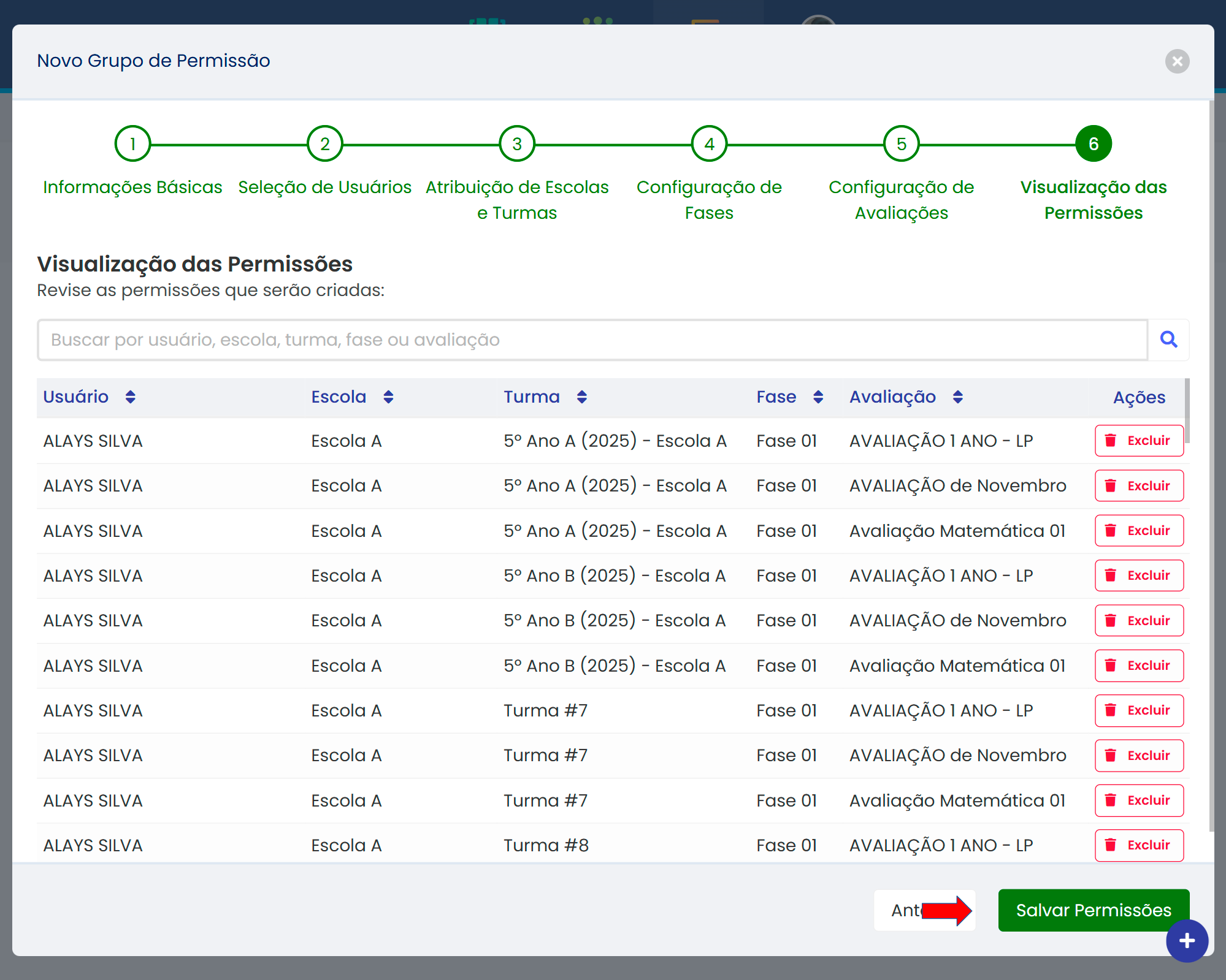 Antes de salvar, é possível excluir permissões específicas usando o botão Excluir na lateral direita.