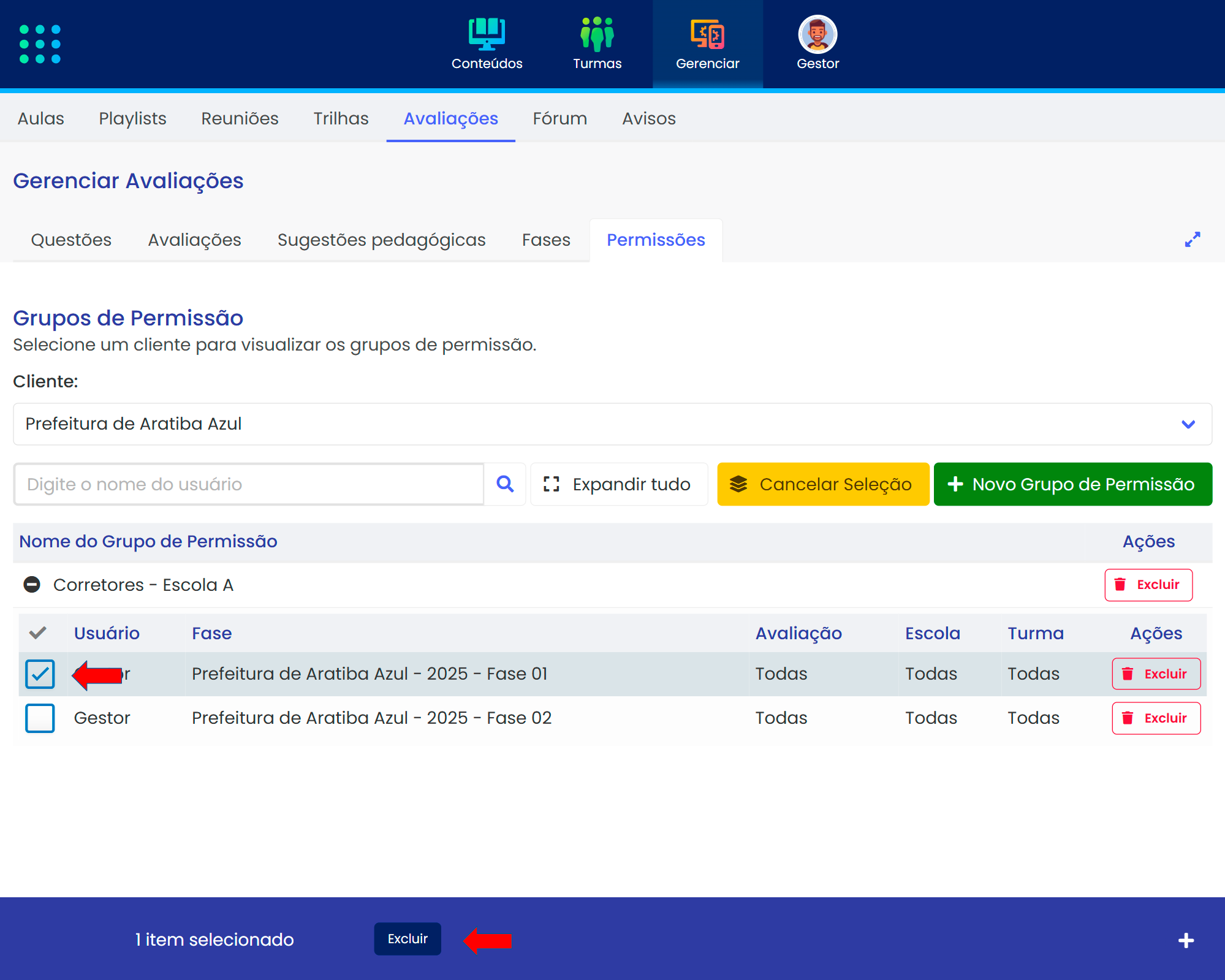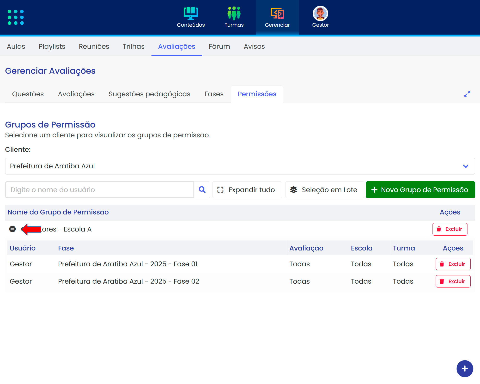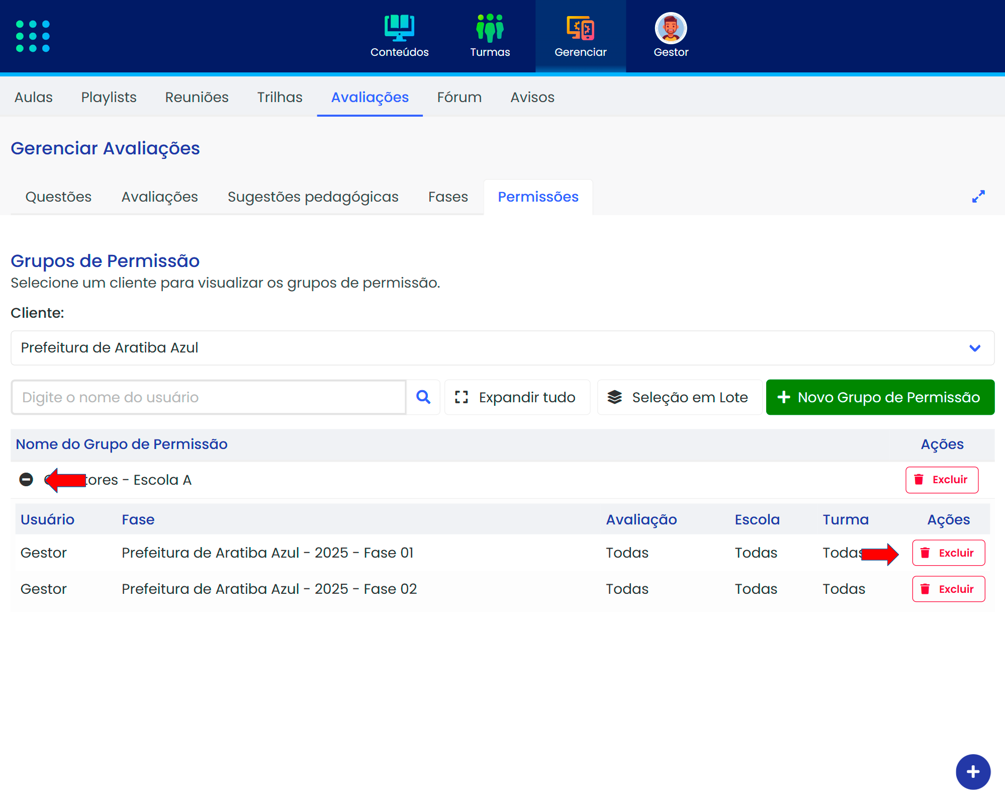 Cada linha da listagem possui um botão Excluir para remover apenas aquela permissão.