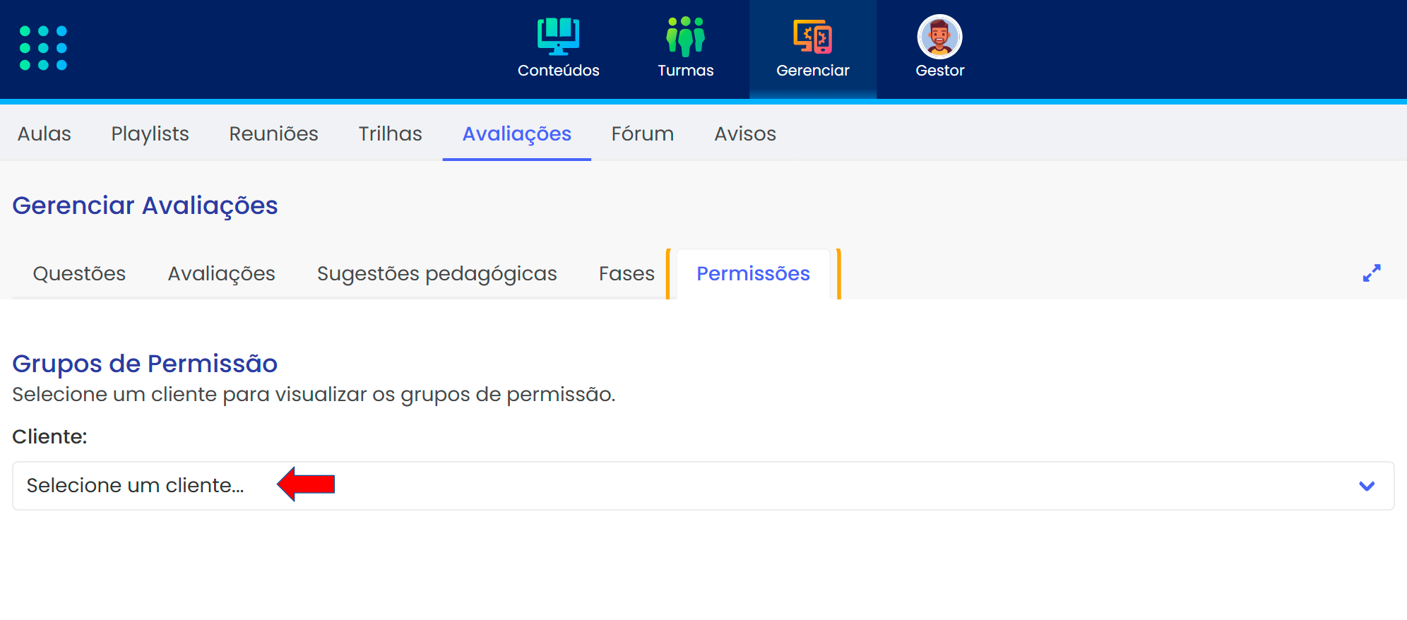 Para utilizar o recurso, após o login, e com acesso de professor, localize a seção Gerenciar. O menu Aulas já estará ativo, caso contrário, selecione-o.