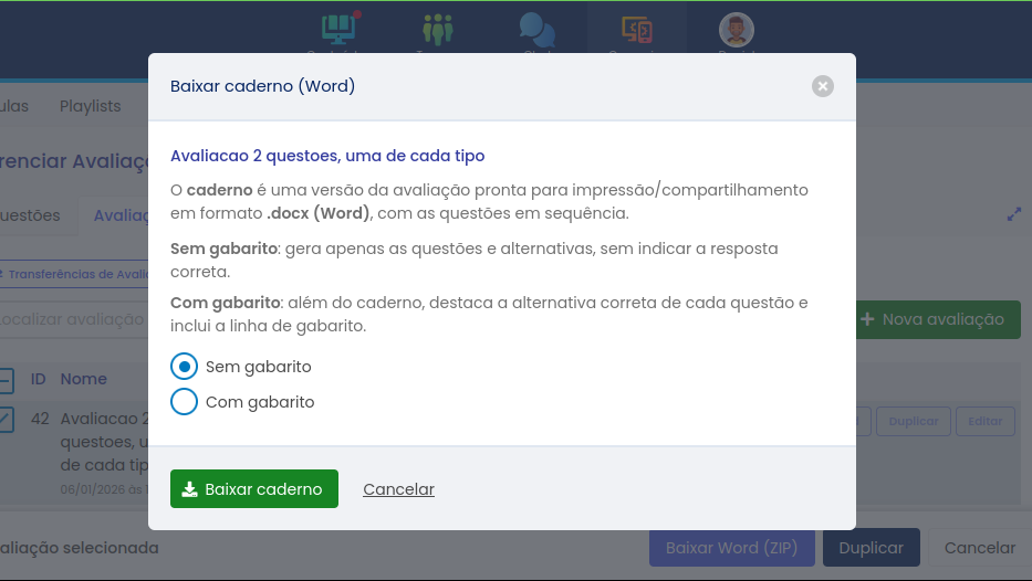 Ao publicar uma avaliação na plataforma, independente da sua finalidade, o usuário poderá utilizar a aula digital normalmente e extrair as suas questões, que funcionarão autonomamente entre si.