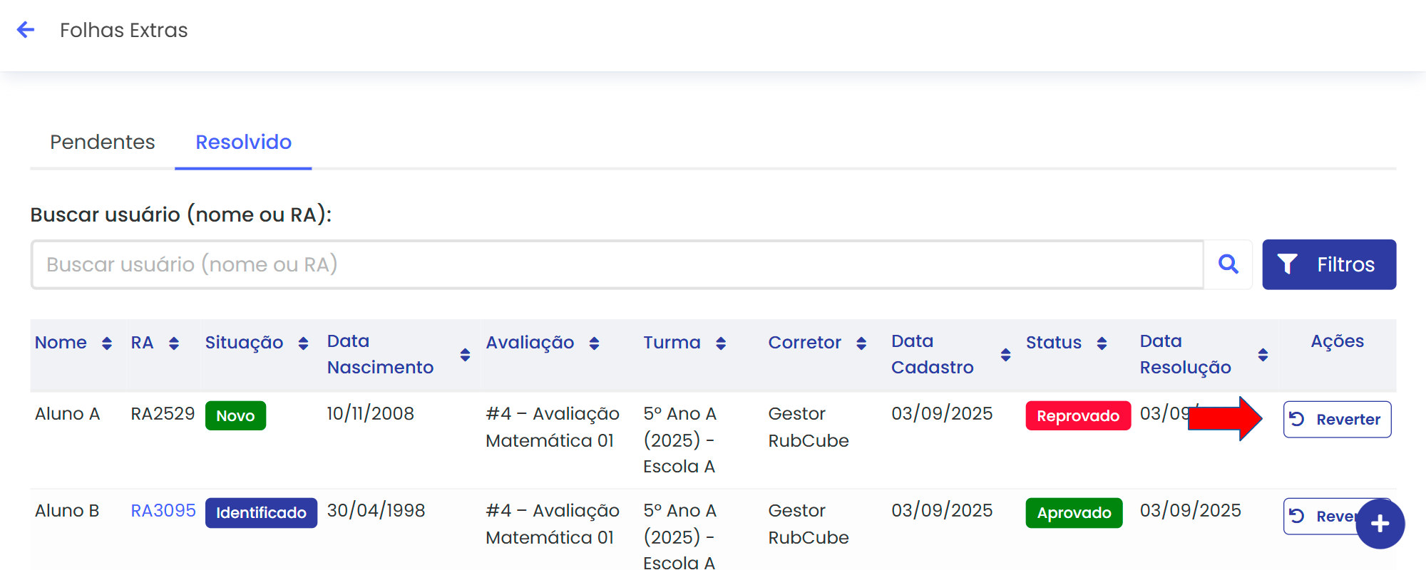 Cada linha mostra a combinação de usuário, escola, turma, fase e avaliação.