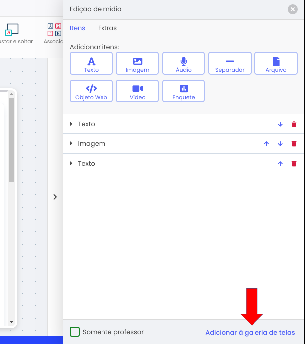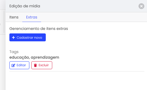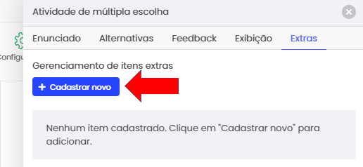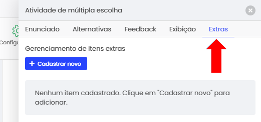 Ao editar uma tela de exercício, uma nova aba chamada Extras estará disponível. Ao selecioná-la, você terá acesso à interface para gerenciamento dos itens associados àquela tela.
