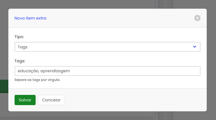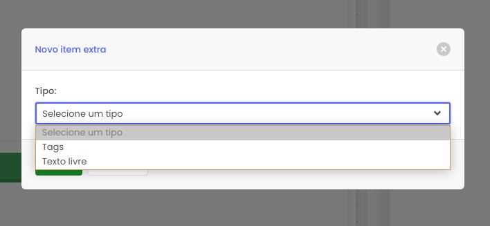 Uma janela será apresentada para escolher o tipo de item extra, sendo eles Tags e Texto Livre.