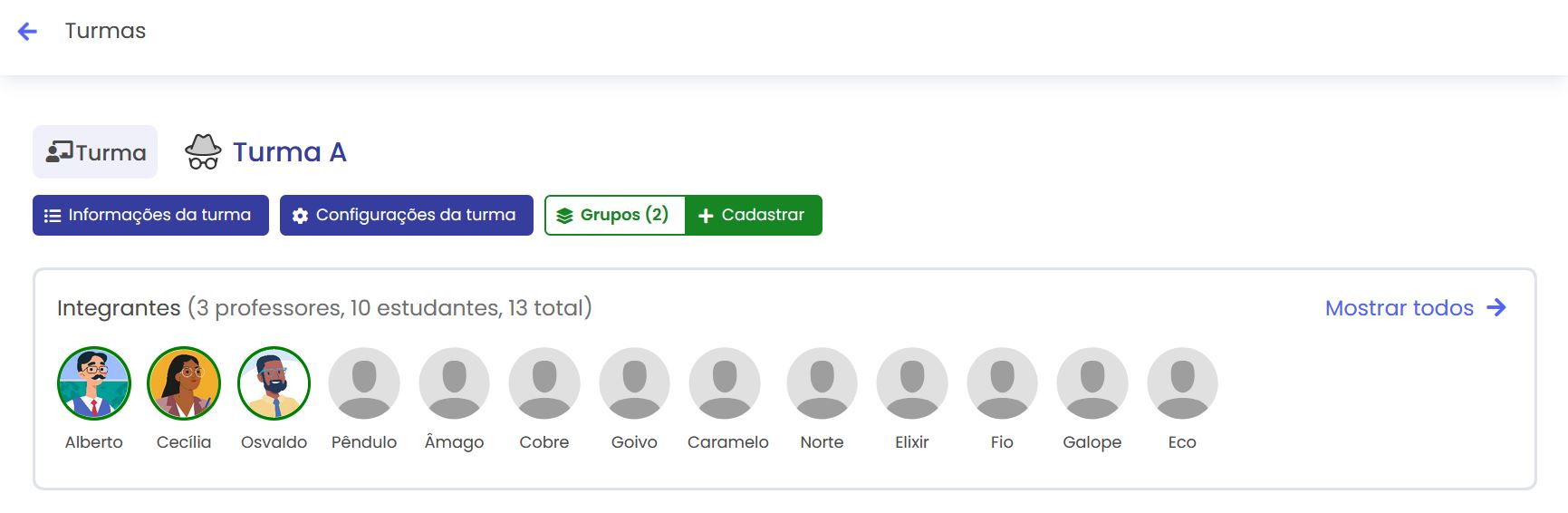 Quando ativada, os professores visualizam outros professores da turma com apelidos. Os estudantes continuam vendo os nomes reais dos professores.