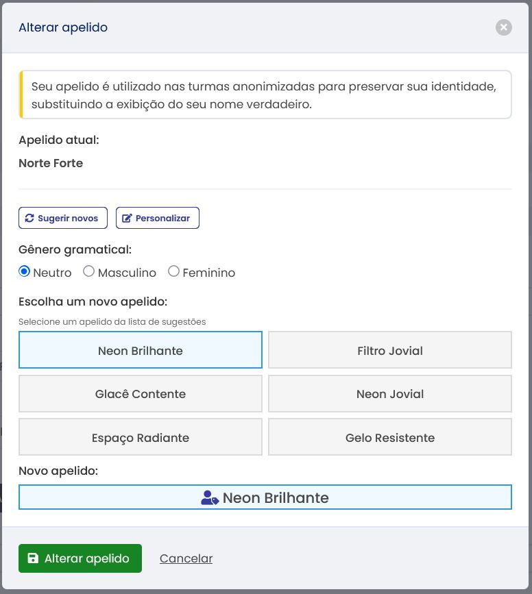 Seu novo apelido será aplicado imediatamente em todas as turmas anonimizadas.