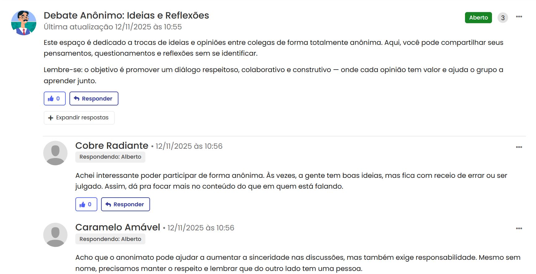 Exemplo de uso: Ideal para promover discussões em fóruns onde estudantes possam expressar opiniões sem influência de relações pessoais prévias.
