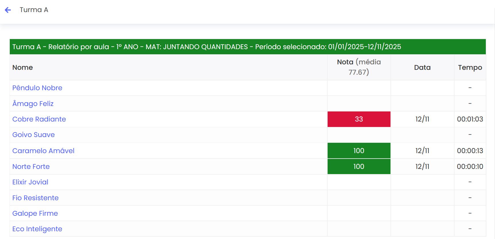 Em relatórios de desempenho, listas de notas e outras exportações de dados, os nomes aparecem como apelidos.