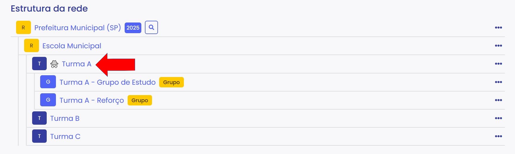 No painel administrativo do cliente, na exibição da estrutura de redes e turmas, turmas anonimizadas exibem o ícone ao lado do nome.
