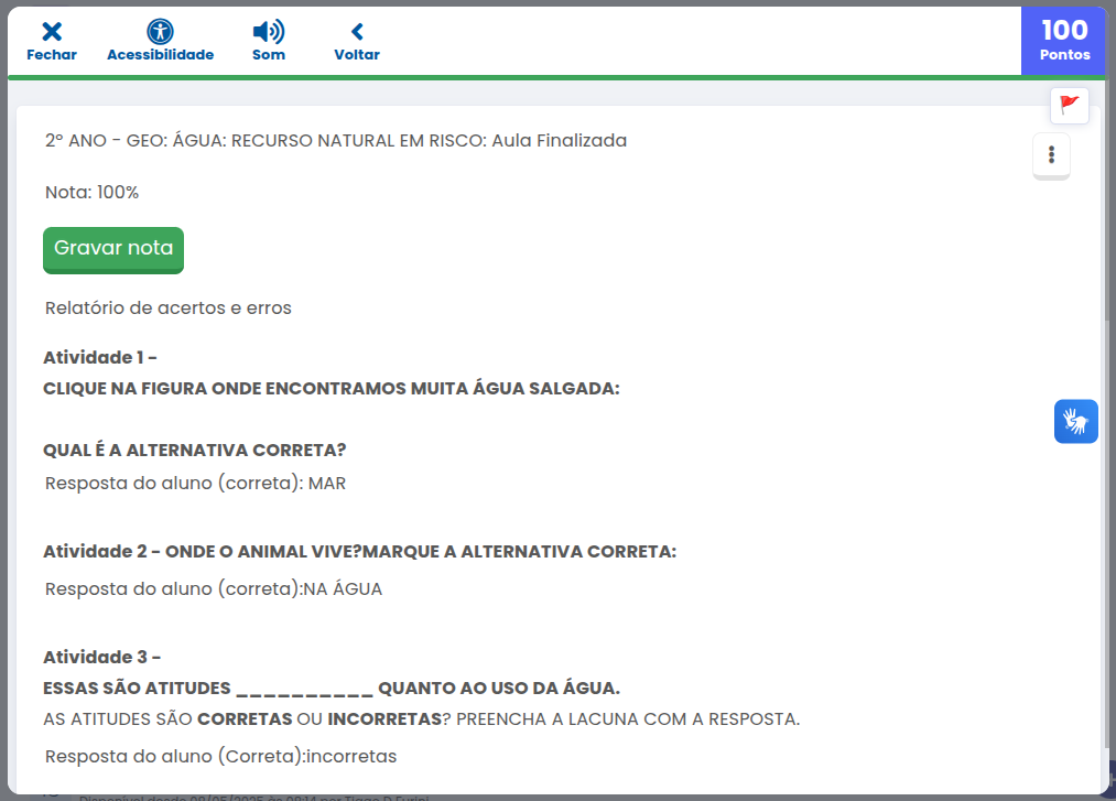 Ao final da aula, a última tela apresenta o relatorio detalhado e a opção para gravar nota.