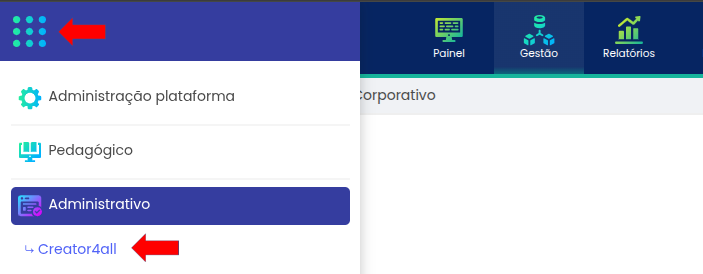 O gerenciamento de matrizes encontra-se localizado no painel administrativo de sua rede de ensino. Para acessar, primeiramente escolha o menu localizado no canto superior esquerdo, na barra de navegação superior da página, e em seguida acesse a sua rede de ensino.