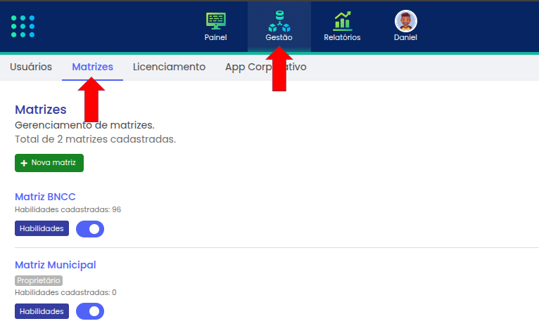 Depois, escolha a opção Gestão e, em seguida, a aba Matrizes.