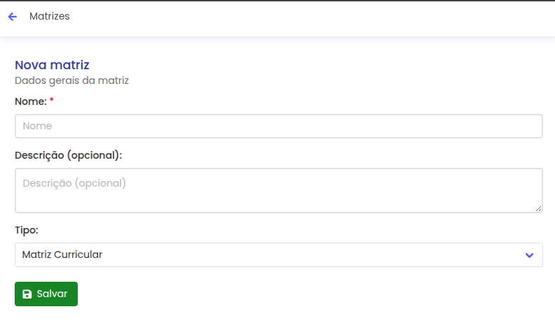 Na página de criar matriz, deverá ser definido um nome para a matriz (campo obrigatório), descrição e o tipo da matriz. As opções de tipos são: