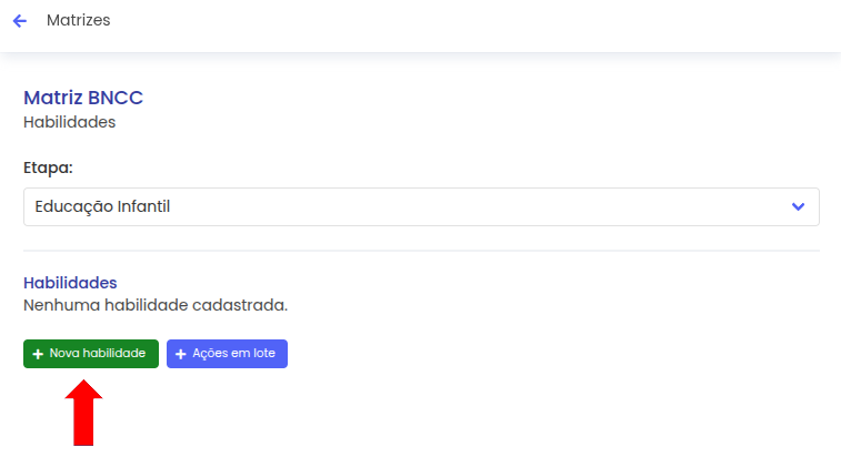 A tela de cadastro de Habilidades, permite a inclusão manual das mesmas por meio do botão Nova habilidade ou importar habilidades em lote, em Ações em lote. Vamos criar uma nova habilidade.