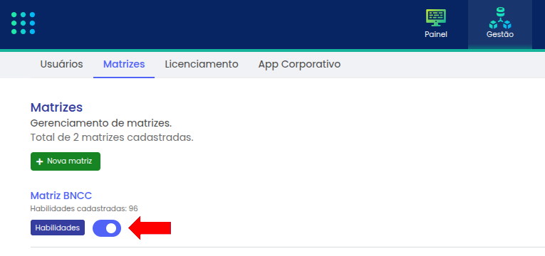 No painel de matrizes, deve-se escolher a matriz desejada e, então, realizar a ativação.